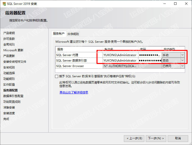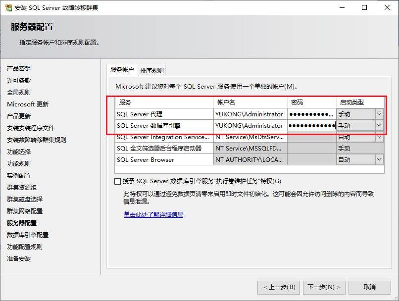 指定sqlserver服务的账户名和密码,这里我们直接用域控账户,也可以在域控建一个账户并给他权限