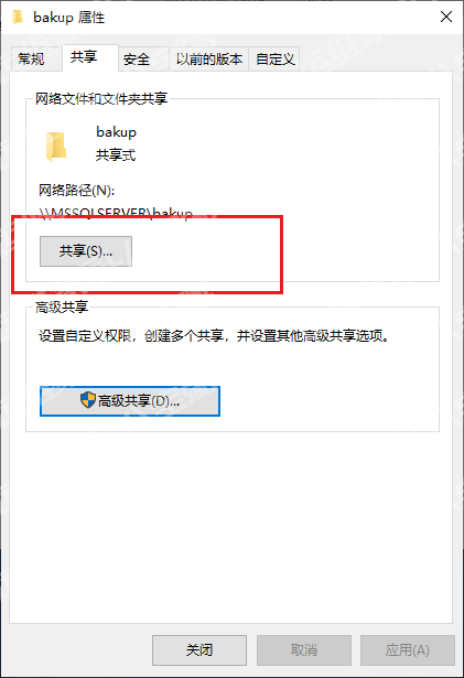 然后共享bakup文件夹,右键bakup文件夹,选择属性>共享>高级共享,给everyone添加完全控制权限