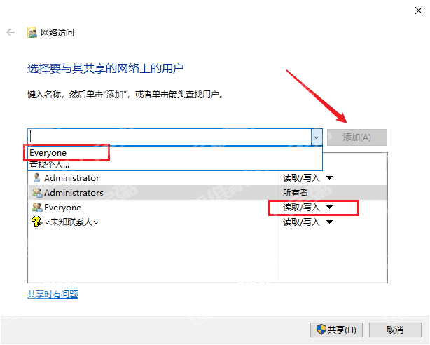 然后选择共享在下拉菜单中选择everyone,并给读写权限,某则后面alwayson检查会报错