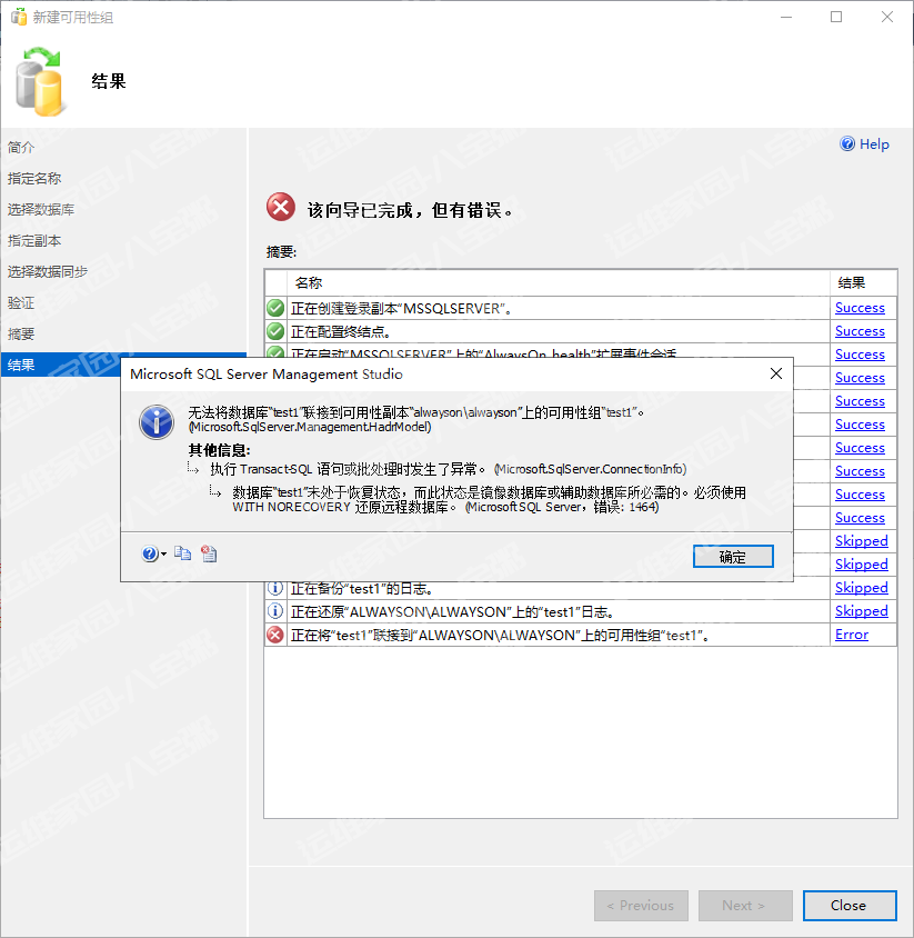无法将数据库“test1”联接到可用性副本“alwayson\alwayson”上的可用性组“test1”。 (Microsoft.SqlServer.Smo)