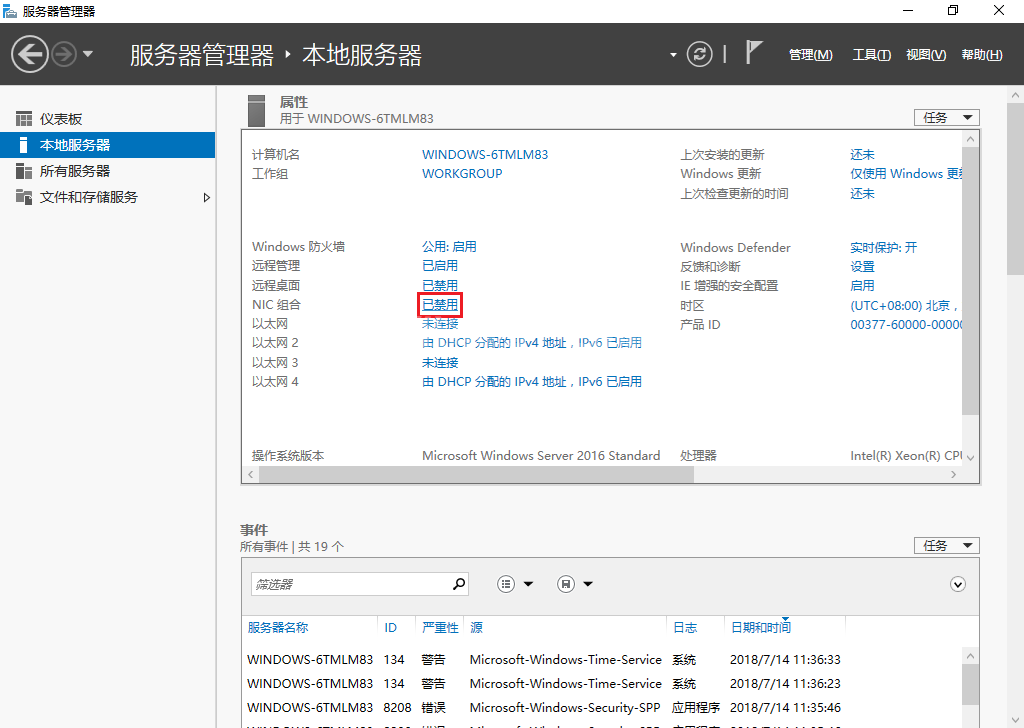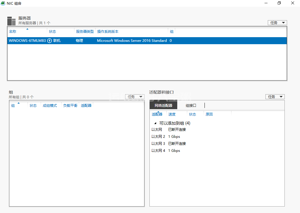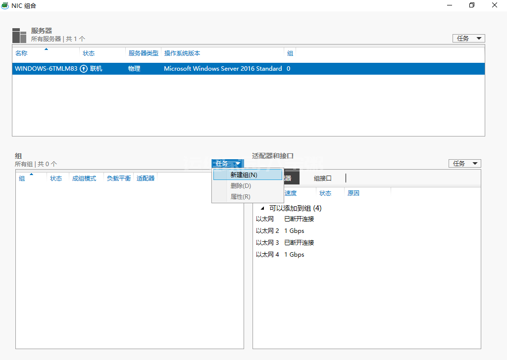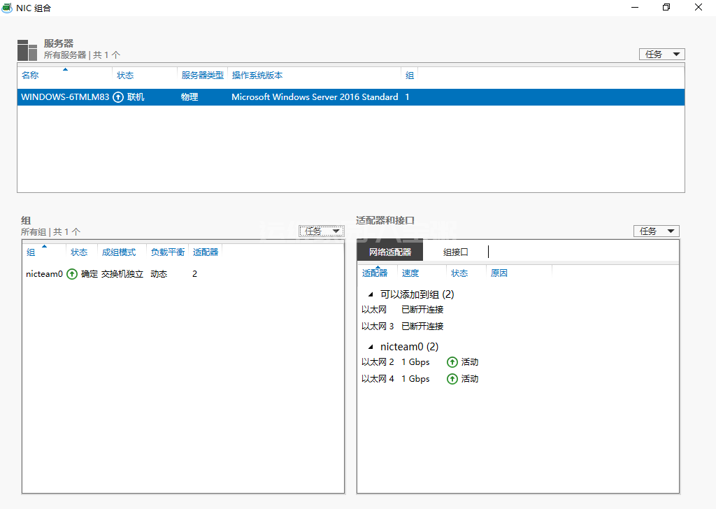 本例介绍在Windows Server 2016系统中,使用系统自带“NIC组合”功能进行网卡绑定操作。