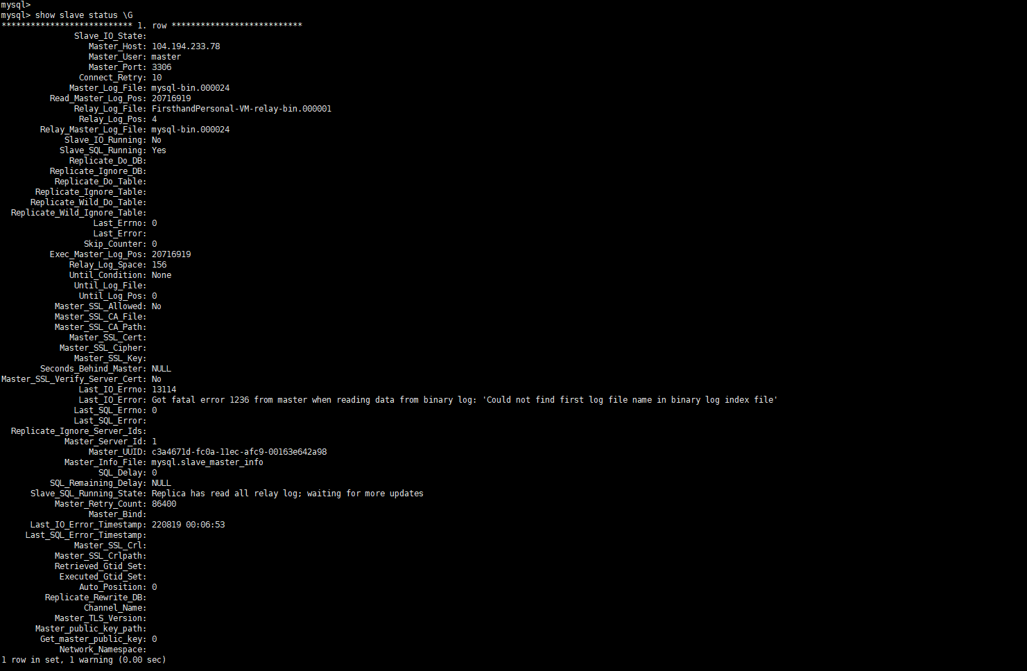 解决方法,先到主库查看 binlog和post数值