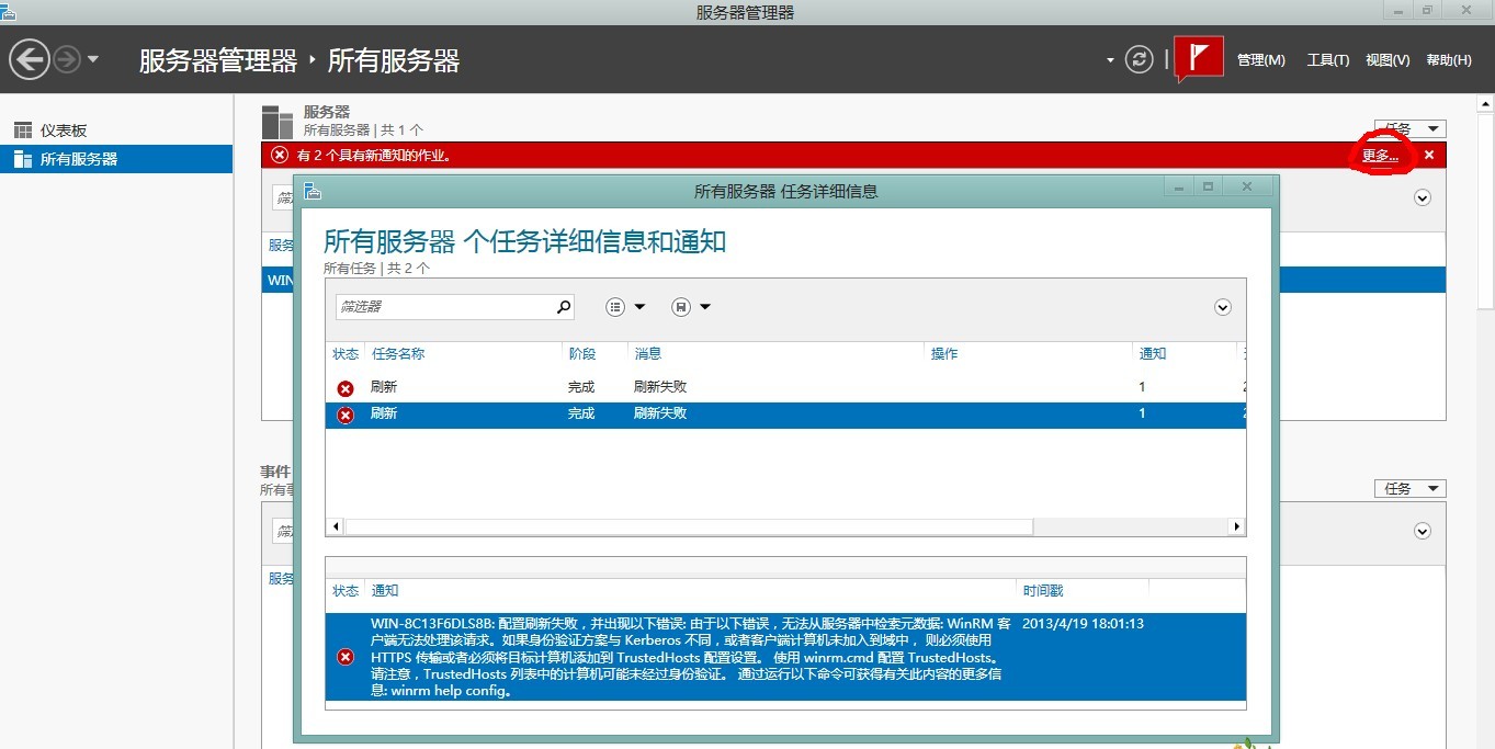在所有服务器中,我们可以看到刚才添加的服务器,但是显示winrm协商身份验证错误,然后我们点击更多,查看错误的详细信息