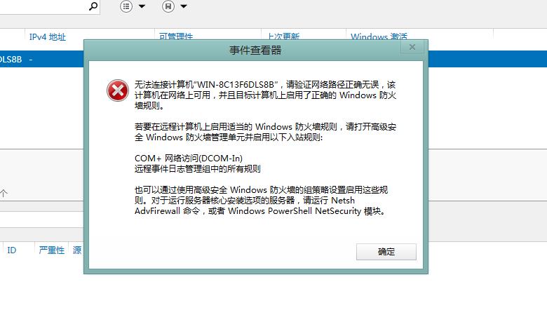 然后我们再回到客户端,右键,刷新,发现错误,换成了 联机-访问被拒绝,我们在上面右键,计算机管理,会有提个弹窗报错,提示我们没有在服务器防火墙上开启相关服务。我们照着提示去服务器上面开启,一共开启了四个服务,com+网络访问,远程事件日志管理的三个服务,就好了