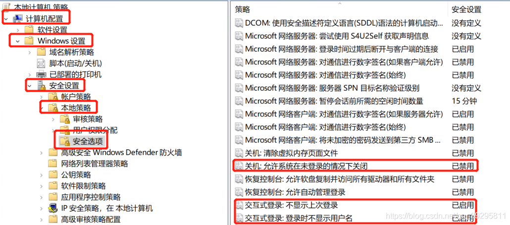 计算机配置->Windows设置->安全设置->本地策略->安全选项