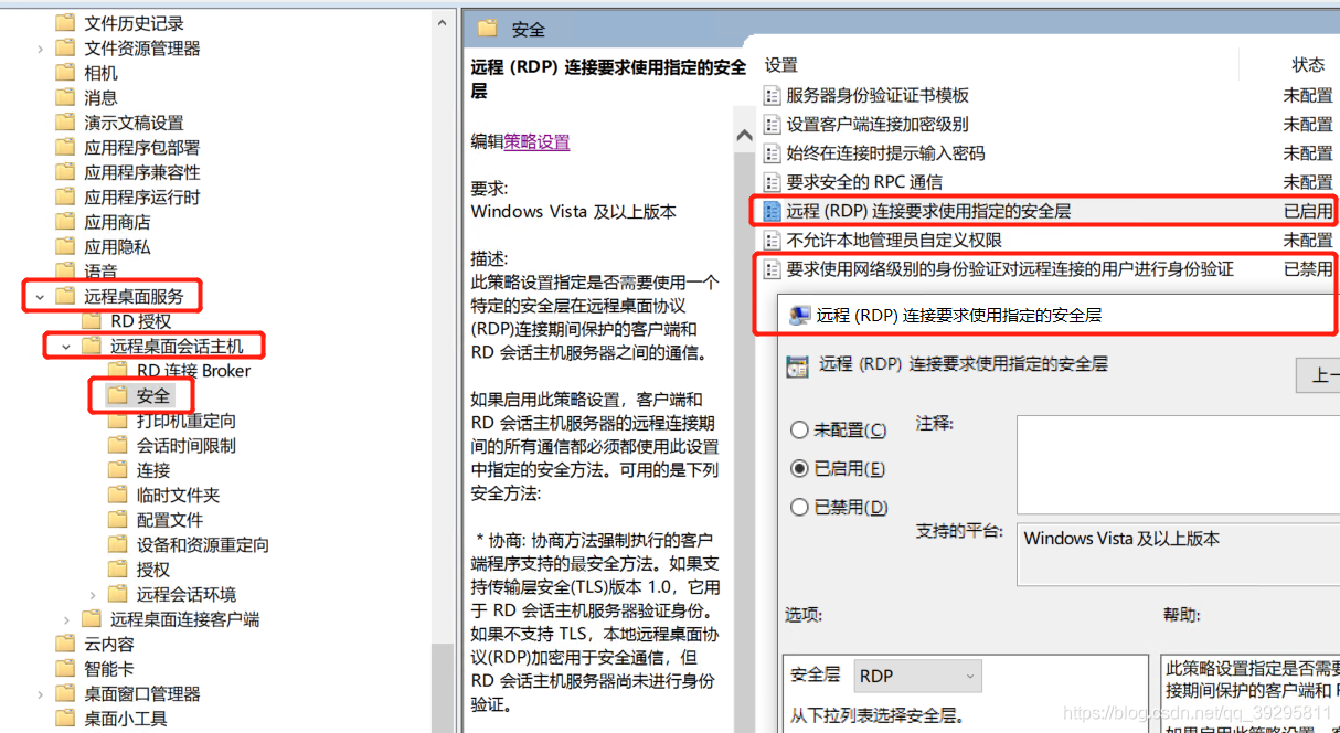 远程(RDP)连接要求使用指定的安全层 已启用 RDP