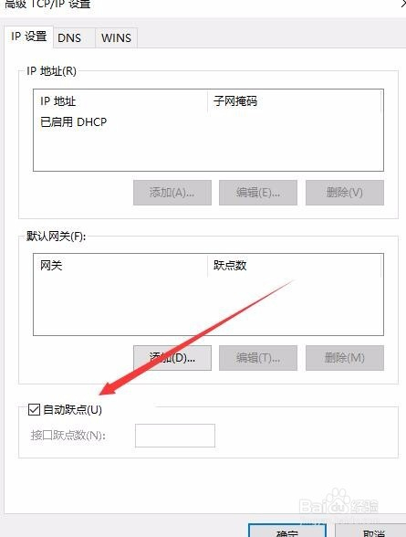 这时会打开TCP/IP设置窗口,可以看到下面的“自动跃点”前有一个复选框,把其前面的勾选去掉