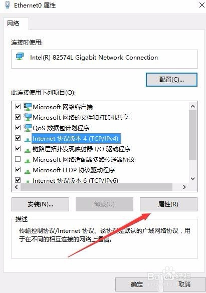 在打开的网卡属性窗口中,选中Internet协议版本(Tcp/IPv4)一项,然后点击下面的“属性”按钮