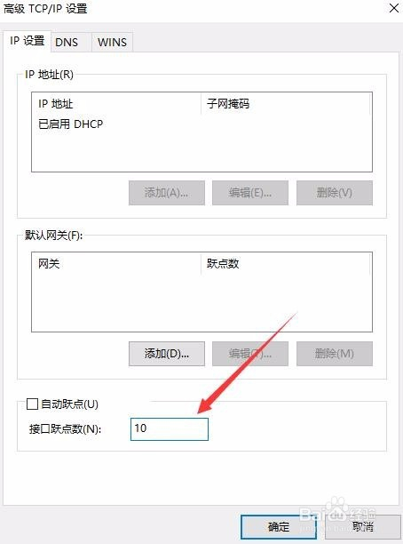 然后在接口跃点数右侧的文本框中输入数字10,最后点击确定按钮就可以了。接下来用同样的办法,把无线网络的跃点数设置为20,这样有线网络的优先级高于无线网络,系统就会自动优先连接有线网络了