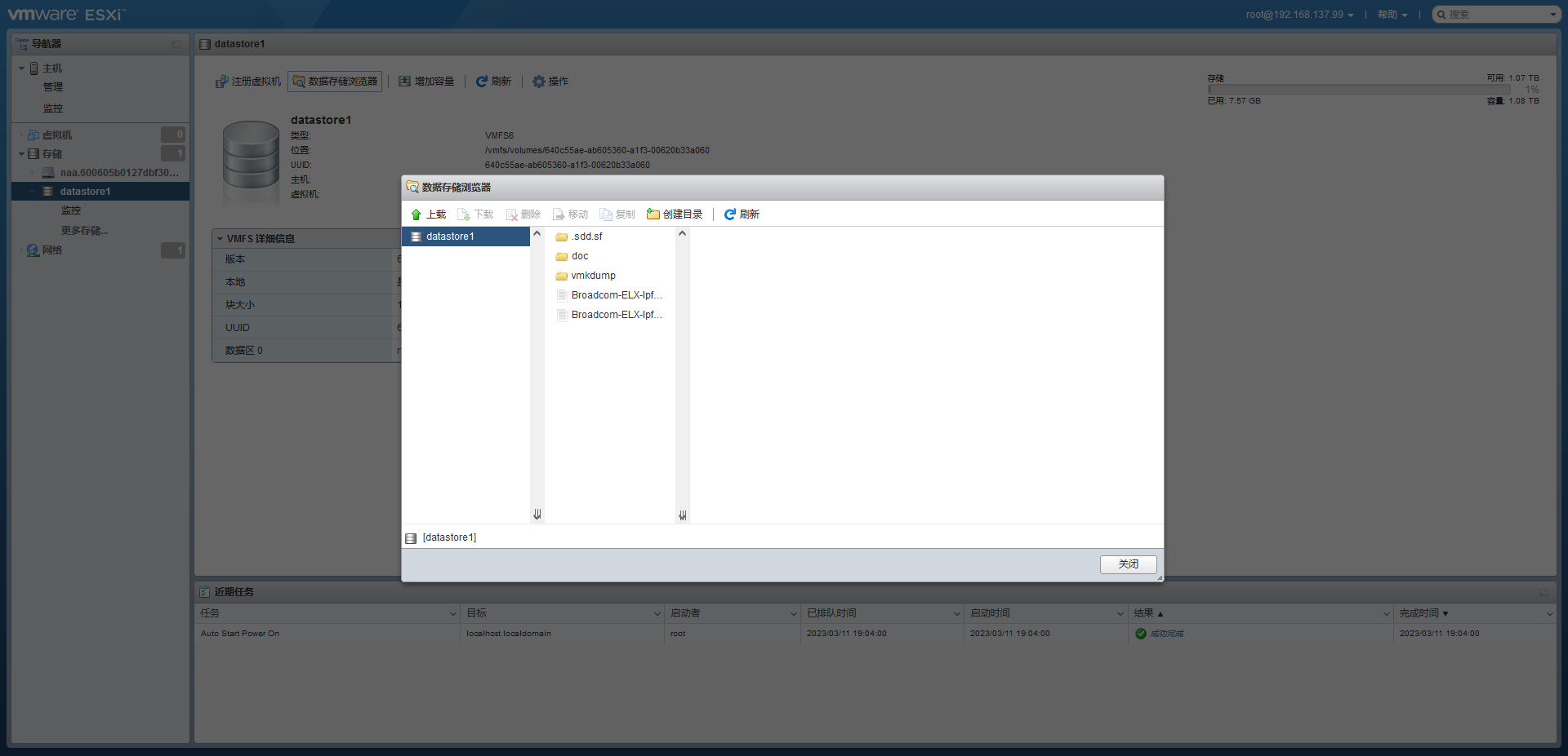 然后把下载下来的驱动通过存储>浏览数据存储上传到datastore目录