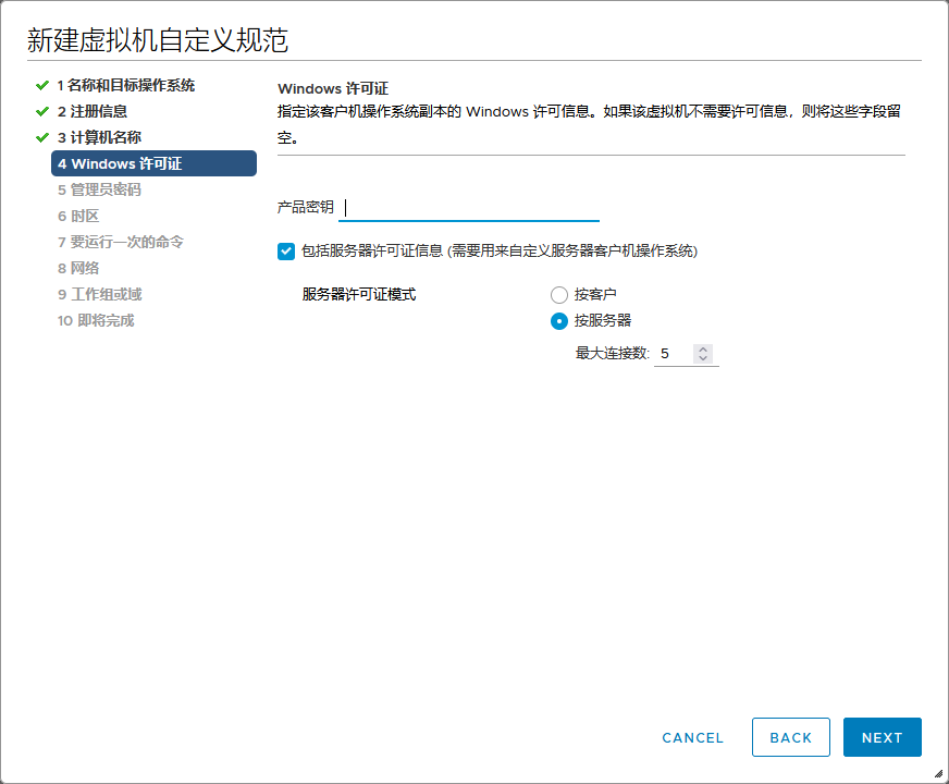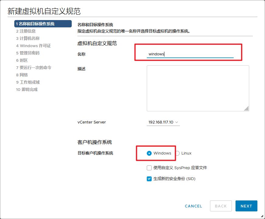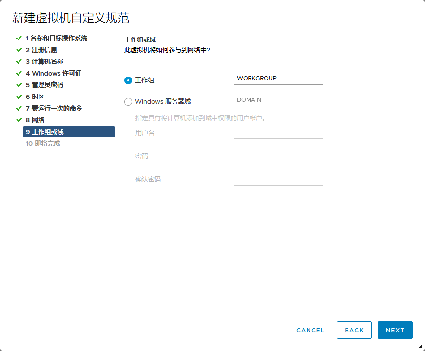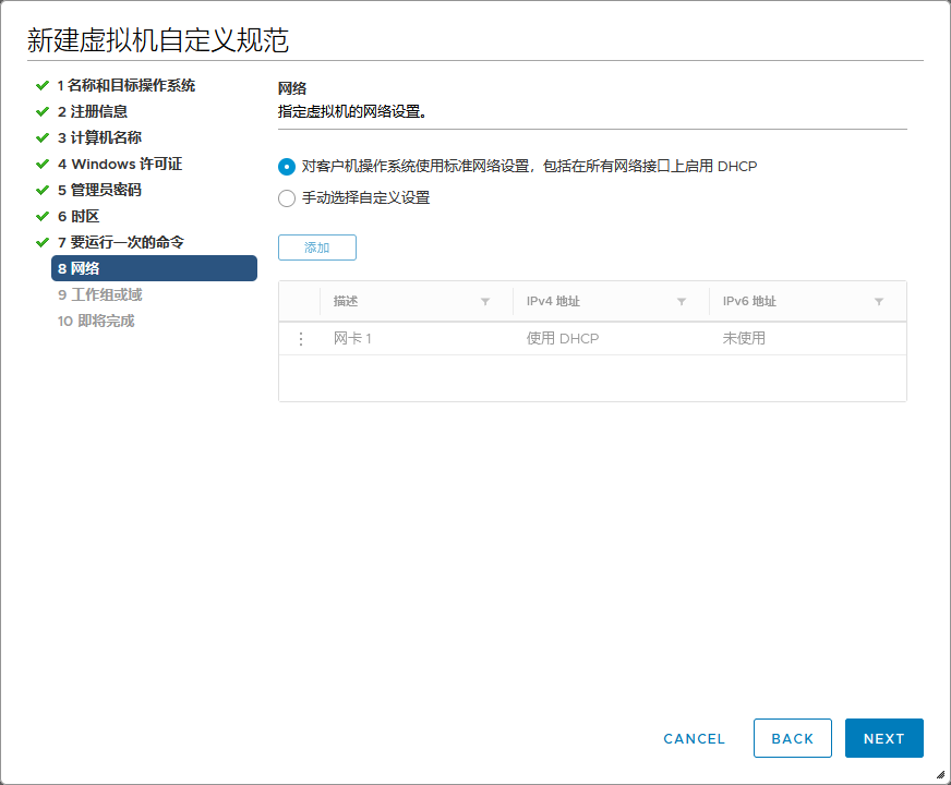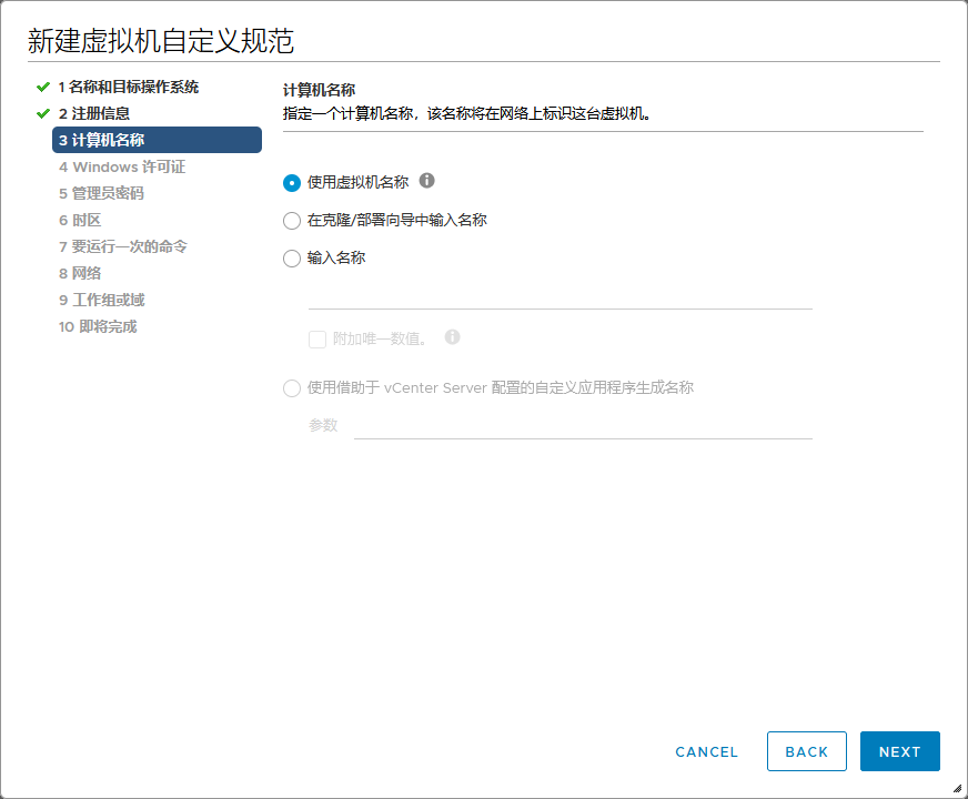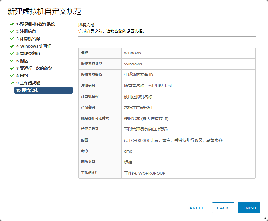 vmware策略设置虚拟机 admin 2023-03-20 10:22 399 人阅读 0 条评论 选择菜单里的策略和配置文件新建虚拟机自定义规范设置规则名称和目标操作系统设置所有者组织和名称计算机名使用虚拟机名称设置密钥设置管理员密码选择时区设置开机要运行的命令设置网络设置工作组或域完成 本文地址:https://www.liuchunjie.top/?id=532 版权声明:本文为原创文章,版权归 admin 所有,欢迎分享本文,转载请保留出处! 点赞 分享: PREVIOUS:tailscale内网穿透安装 NEXT:VMSA-2021-0002漏洞修复 文章导航