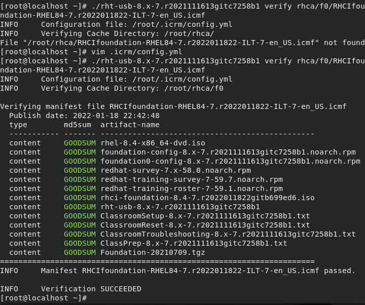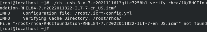 执行./rht-usb-8.x-7.r2021111613gitc7258b1 verify rhca/f0/RHCIfoundation-RHEL84-7.r2022011822-ILT-7-en_US.icmf 校验文件