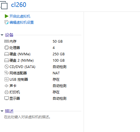 再新建一个虚拟机,内存51G,硬盘250G,再把刚刚创建的启动盘添加上,配置如下