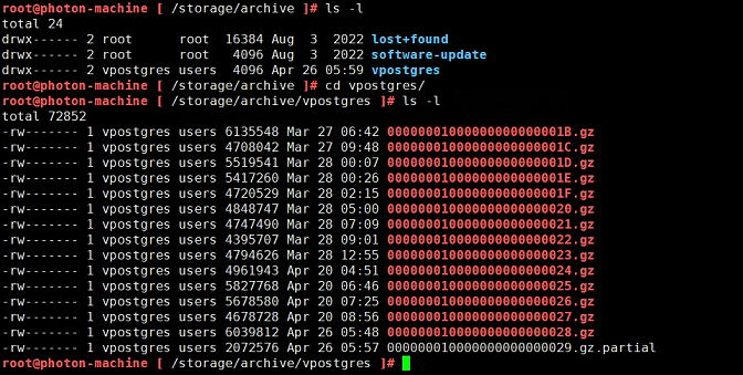 root@photon-machine [ ~ ]# cd /storage/archive/vpostgres