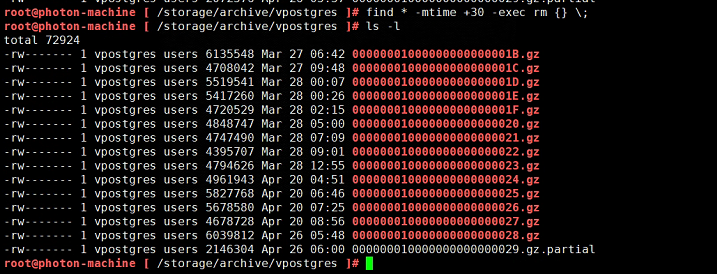 root@photon-machine [ /storage/archive/vpostgres ]# find * -mtime +30 -exec rm {} \; #删除30天之前的日志,因为没有30天之前的日志,所以不用删除