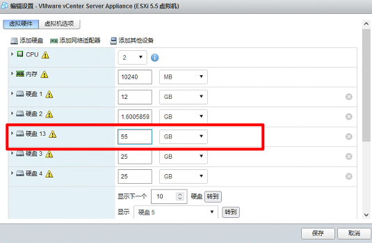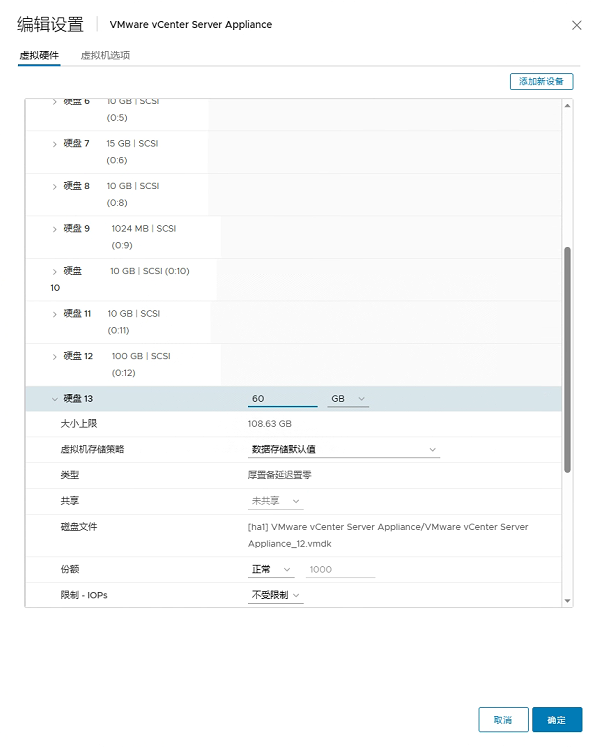 首先编辑虚拟机,然后直接把磁盘13,也就是archive所在的磁盘加容量,注意要先删除所有的快照,不然会提示失败 - 设备的操作无效。