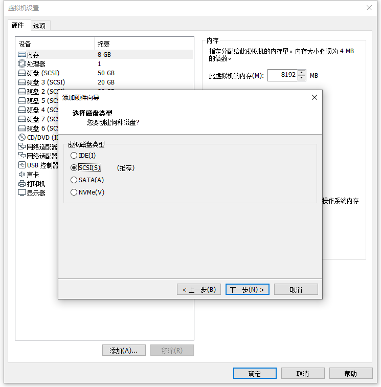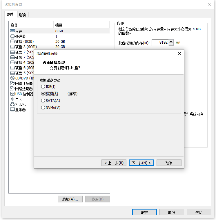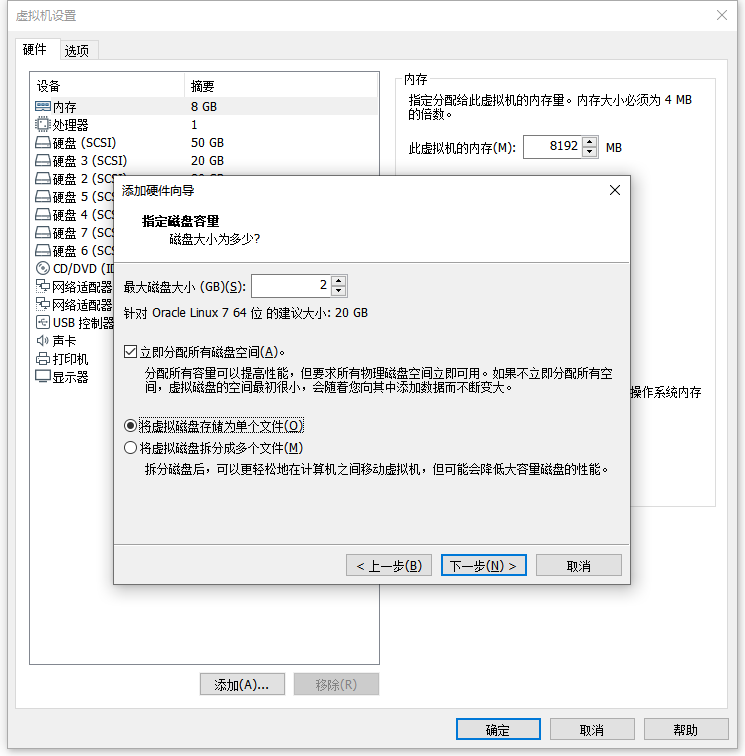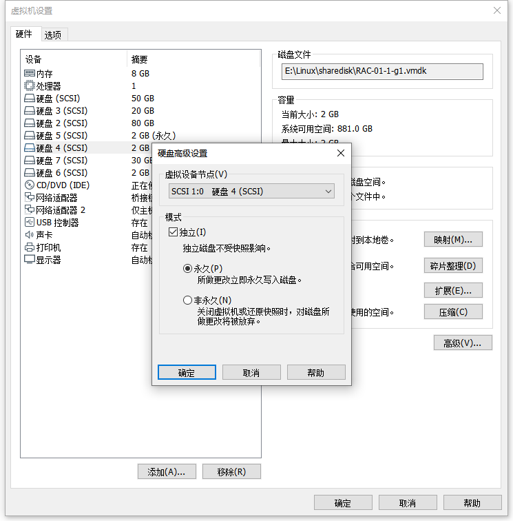 1:编辑虚拟机设置 - 添加 - 硬盘 - SCSI - 创建新虚拟磁盘 - 磁盘大小:2G/立即分配所有磁盘空间 - 浏览路径:E:\Linux\sharedisk - 文件名:RAC-01-1-g1 - 保存/完成 - 高级 - 虚拟设备节点:SCSI 1:0 - 模式:勾选 独立/永久 - 确定