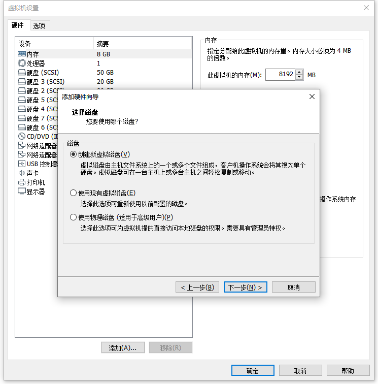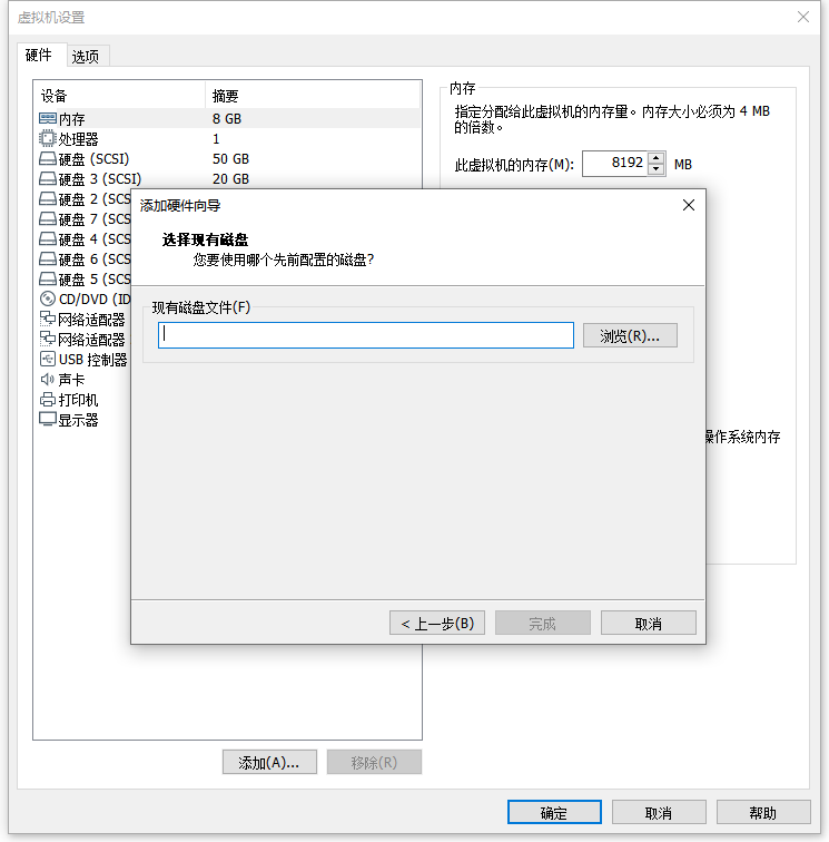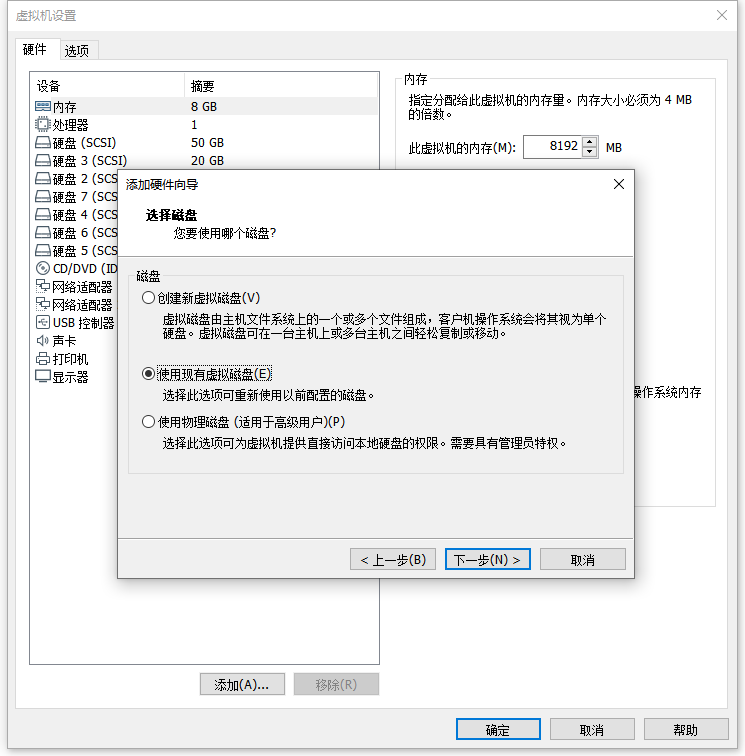 一是添加磁盘选择 使用现有虚拟磁盘