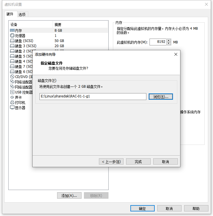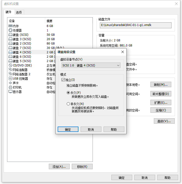 2:添加 - 硬盘 - SCSI - 创建新虚拟磁盘 - 磁盘大小:2G/立即分配所有磁盘空间 - 浏览路径:E:\Linux\sharedisk - 文件名:RAC-01-1-g2 - 保存/完成 - 高级 - 虚拟设备节点:SCSI 1:1 - 模式:勾选 独立/永久 - 确定