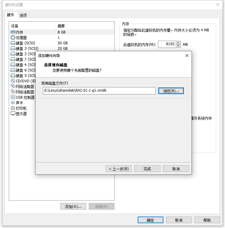 4:添加 - 硬盘 - SCSI - 使用现有虚拟磁盘 - 浏览:选择 E:\Linux\sharedisk\RAC-01-1-data.vmdk - 完成 - 高级 - 虚拟设备节点:SCSI 1:3 - 模式:勾选 独立/永久 - 确定