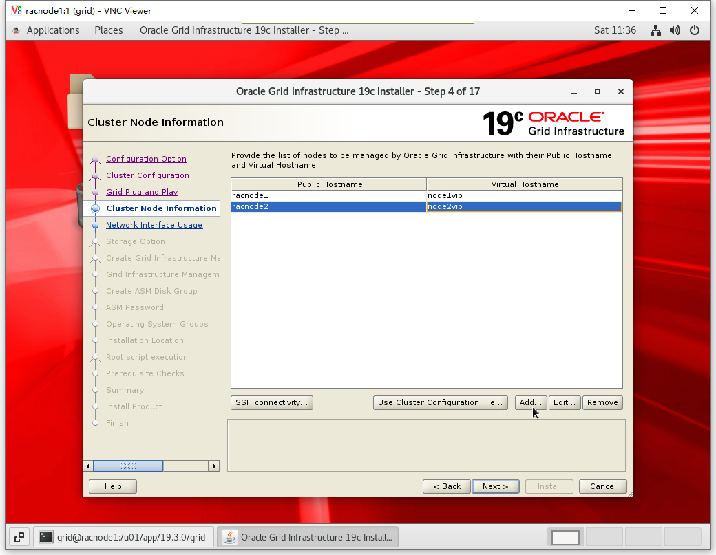 [root@racnode2 ~]# /u01/app/19.3.0/grid/root.sh Performing root user operation. The following environment variables are set as: ORACLE_OWNER= grid ORACLE_HOME= /u01/app/19.3.0/grid Enter the full pathname of the local bin directory: [/usr/local/bin]: Copying dbhome to /usr/local/bin ... Copying oraenv to /usr/local/bin ... Copying coraenv to /usr/local/bin ... Creating /etc/oratab file... Entries will be added to the /etc/oratab file as needed by Database Configuration Assistant when a database is created Finished running generic part of root script. Now product-specific root actions will be performed. Relinking oracle with rac_on option Using configuration parameter file: /u01/app/19.3.0/grid/crs/install/crsconfig_params The log of current session can be found at: /u01/app/grid/crsdata/racnode2/crsconfig/rootcrs_racnode2_2020-10-10_12-11-18AM.log 2020/10/10 12:11:20 CLSRSC-594: Executing installation step 1 of 19: 'SetupTFA'. 2020/10/10 12:11:20 CLSRSC-594: Executing installation step 2 of 19: 'ValidateEnv'. 2020/10/10 12:11:20 CLSRSC-363: User ignored prerequisites during installation 2020/10/10 12:11:20 CLSRSC-594: Executing installation step 3 of 19: 'CheckFirstNode'. 2020/10/10 12:11:22 CLSRSC-594: Executing installation step 4 of 19: 'GenSiteGUIDs'. 2020/10/10 12:11:22 CLSRSC-594: Executing installation step 5 of 19: 'SetupOSD'. 2020/10/10 12:11:23 CLSRSC-594: Executing installation step 6 of 19: 'CheckCRSConfig'. 2020/10/10 12:11:24 CLSRSC-594: Executing installation step 7 of 19: 'SetupLocalGPNP'. 2020/10/10 12:11:26 CLSRSC-594: Executing installation step 8 of 19: 'CreateRootCert'. 2020/10/10 12:11:27 CLSRSC-594: Executing installation step 9 of 19: 'ConfigOLR'. 2020/10/10 12:11:41 CLSRSC-594: Executing installation step 10 of 19: 'ConfigCHMOS'. 2020/10/10 12:11:41 CLSRSC-594: Executing installation step 11 of 19: 'CreateOHASD'. 2020/10/10 12:11:43 CLSRSC-594: Executing installation step 12 of 19: 'ConfigOHASD'. 2020/10/10 12:11:43 CLSRSC-330: Adding Clusterware entries to file 'oracle-ohasd.service' 2020/10/10 12:12:02 CLSRSC-594: Executing installation step 13 of 19: 'InstallAFD'. 2020/10/10 12:12:02 CLSRSC-594: Executing installation step 14 of 19: 'InstallACFS'. 2020/10/10 12:12:45 CLSRSC-594: Executing installation step 15 of 19: 'InstallKA'. 2020/10/10 12:12:46 CLSRSC-594: Executing installation step 16 of 19: 'InitConfig'. Redirecting to /bin/systemctl restart rsyslog.service 2020/10/10 12:12:55 CLSRSC-594: Executing installation step 17 of 19: 'StartCluster'. 2020/10/10 12:12:55 CLSRSC-4002: Successfully installed Oracle Trace File Analyzer (TFA) Collector. 2020/10/10 12:13:42 CLSRSC-343: Successfully started Oracle Clusterware stack 2020/10/10 12:13:43 CLSRSC-594: Executing installation step 18 of 19: 'ConfigNode'. 2020/10/10 12:13:58 CLSRSC-594: Executing installation step 19 of 19: 'PostConfig'. 2020/10/10 12:14:05 CLSRSC-325: Configure Oracle Grid Infrastructure for a Cluster ... succeeded