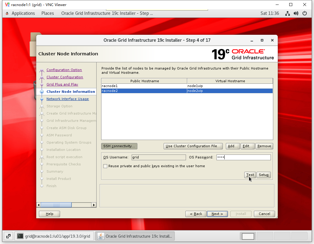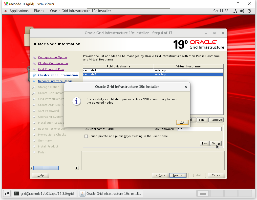 cat ~/.ssh/id_rsa.pub >> ~/.ssh/authorized_keys cat ~/.ssh/id_dsa.pub >> ~/.ssh/authorized_keys ssh racnode2 cat ~/.ssh/id_rsa.pub >> ~/.ssh/authorized_keys ssh racnode2 cat ~/.ssh/id_dsa.pub >> ~/.ssh/authorized_keys scp /home/grid/.ssh/authorized_keys racnode2:~/.ssh/authorized_keys