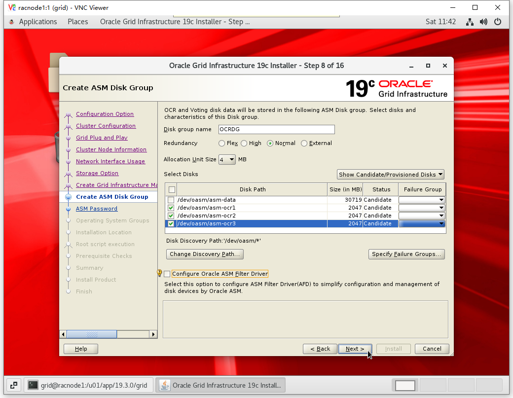 | /dev/sdd | 2G | asm-ocr1 | OCR/Voting File |