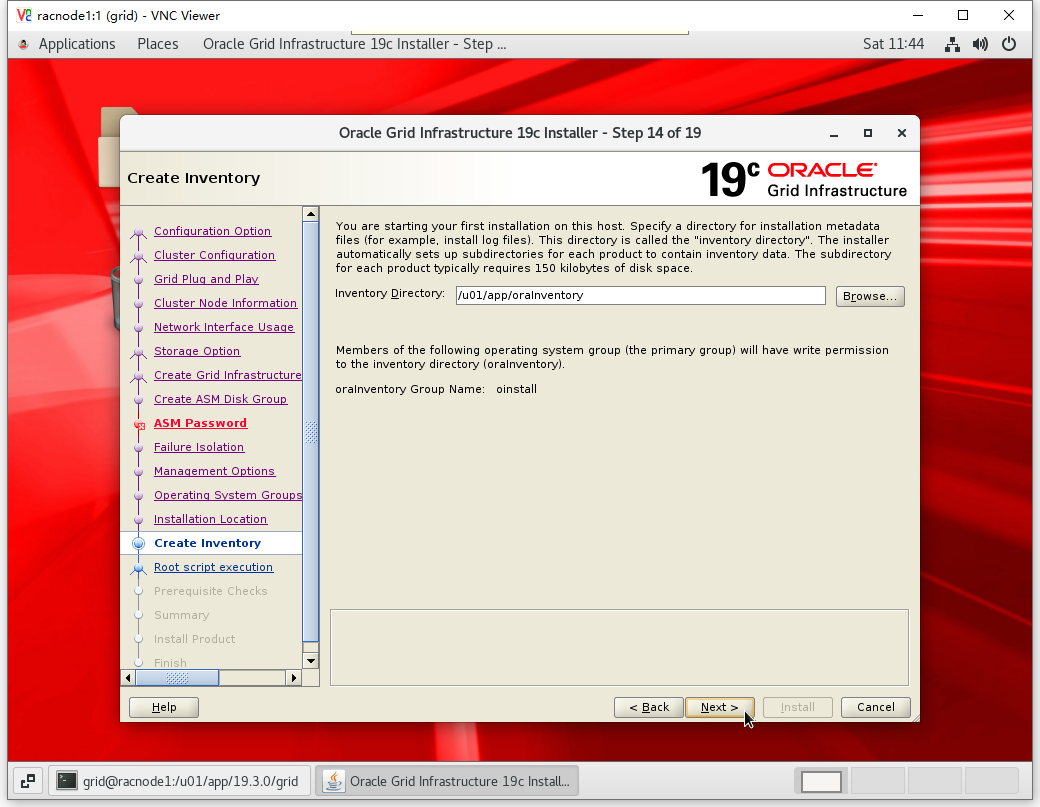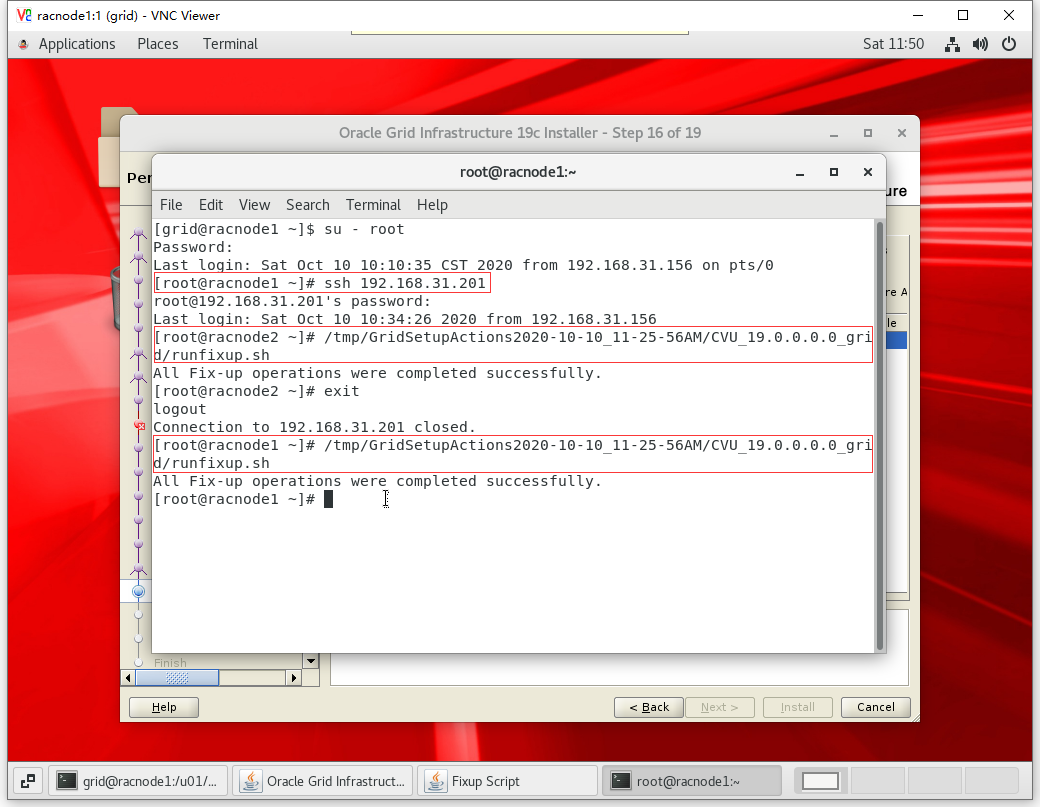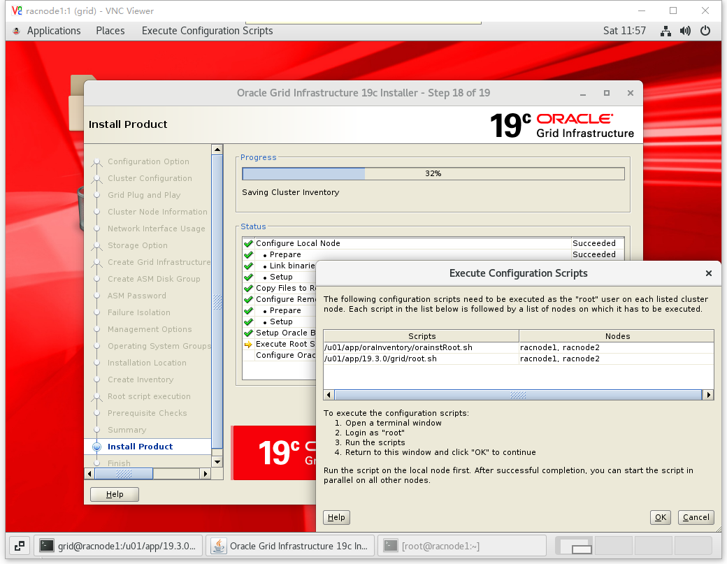 [root@racnode1 ~]# /u01/app/oraInventory/orainstRoot.sh Changing permissions of /u01/app/oraInventory. Adding read,write permissions for group. Removing read,write,execute permissions for world. Changing groupname of /u01/app/oraInventory to oinstall. The execution of the script is complete.