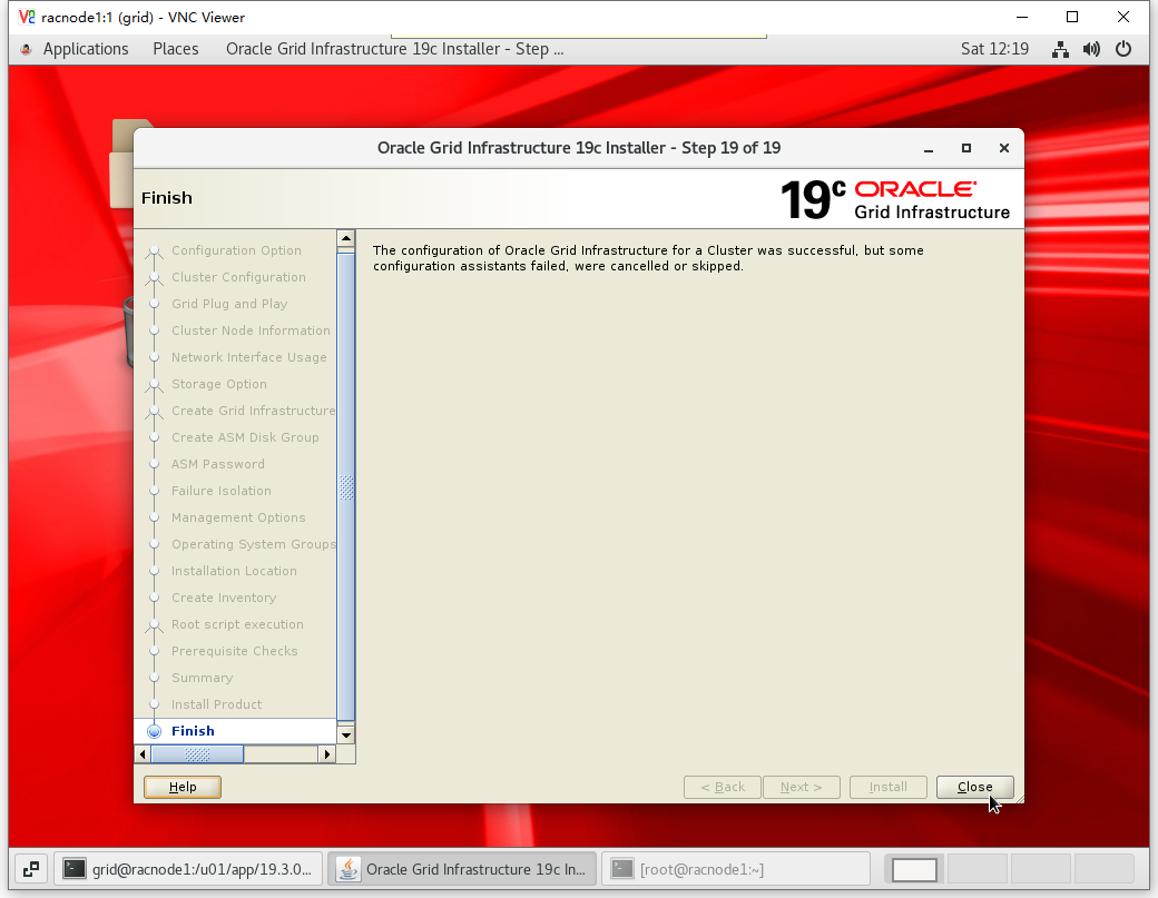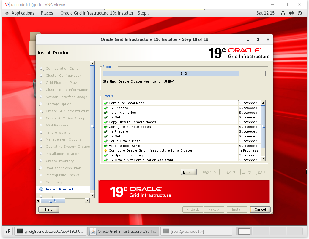 [root@racnode1 ~]# /u01/app/oraInventory/orainstRoot.sh Changing permissions of /u01/app/oraInventory. Adding read,write permissions for group. Removing read,write,execute permissions for world. Changing groupname of /u01/app/oraInventory to oinstall. The execution of the script is complete. [root@racnode1 ~]# /u01/app/19.3.0/grid/root.sh Performing root user operation. The following environment variables are set as: ORACLE_OWNER= grid ORACLE_HOME= /u01/app/19.3.0/grid Enter the full pathname of the local bin directory: [/usr/local/bin]: Copying dbhome to /usr/local/bin ... Copying oraenv to /usr/local/bin ... Copying coraenv to /usr/local/bin ... Creating /etc/oratab file... Entries will be added to the /etc/oratab file as needed by Database Configuration Assistant when a database is created Finished running generic part of root script. Now product-specific root actions will be performed. Relinking oracle with rac_on option Using configuration parameter file: /u01/app/19.3.0/grid/crs/install/crsconfig_params The log of current session can be found at: /u01/app/grid/crsdata/racnode1/crsconfig/rootcrs_racnode1_2020-10-10_12-00-08AM.log 2020/10/10 12:00:15 CLSRSC-594: Executing installation step 1 of 19: 'SetupTFA'. 2020/10/10 12:00:15 CLSRSC-594: Executing installation step 2 of 19: 'ValidateEnv'. 2020/10/10 12:00:15 CLSRSC-363: User ignored prerequisites during installation 2020/10/10 12:00:15 CLSRSC-594: Executing installation step 3 of 19: 'CheckFirstNode'. 2020/10/10 12:00:18 CLSRSC-594: Executing installation step 4 of 19: 'GenSiteGUIDs'. 2020/10/10 12:00:19 CLSRSC-594: Executing installation step 5 of 19: 'SetupOSD'. 2020/10/10 12:00:19 CLSRSC-594: Executing installation step 6 of 19: 'CheckCRSConfig'. 2020/10/10 12:00:20 CLSRSC-594: Executing installation step 7 of 19: 'SetupLocalGPNP'. 2020/10/10 12:00:36 CLSRSC-594: Executing installation step 8 of 19: 'CreateRootCert'. 2020/10/10 12:00:42 CLSRSC-594: Executing installation step 9 of 19: 'ConfigOLR'. 2020/10/10 12:01:04 CLSRSC-594: Executing installation step 10 of 19: 'ConfigCHMOS'. 2020/10/10 12:01:05 CLSRSC-594: Executing installation step 11 of 19: 'CreateOHASD'. 2020/10/10 12:01:14 CLSRSC-594: Executing installation step 12 of 19: 'ConfigOHASD'. 2020/10/10 12:01:15 CLSRSC-330: Adding Clusterware entries to file 'oracle-ohasd.service' 2020/10/10 12:01:34 CLSRSC-594: Executing installation step 13 of 19: 'InstallAFD'. 2020/10/10 12:01:34 CLSRSC-594: Executing installation step 14 of 19: 'InstallACFS'. 2020/10/10 12:01:38 CLSRSC-4002: Successfully installed Oracle Trace File Analyzer (TFA) Collector. 2020/10/10 12:02:04 CLSRSC-594: Executing installation step 15 of 19: 'InstallKA'. 2020/10/10 12:02:08 CLSRSC-594: Executing installation step 16 of 19: 'InitConfig'. Redirecting to /bin/systemctl restart rsyslog.service ASM has been created and started successfully. [DBT-30001] Disk groups created successfully. Check /u01/app/grid/cfgtoollogs/asmca/asmca-201010PM120239.log for details. 2020/10/10 12:03:32 CLSRSC-482: Running command: '/u01/app/19.3.0/grid/bin/ocrconfig -upgrade grid oinstall' CRS-4256: Updating the profile Successful addition of voting disk be92bb6d24b14f3dbf20624b176c5a05. Successful addition of voting disk 67641d8f6cc84f32bfb50207eac7d87e. Successful addition of voting disk 84be0f12ad1c4f6fbf08a9aca3d5a3d3. Successfully replaced voting disk group with +OCRDG. CRS-4256: Updating the profile CRS-4266: Voting file(s) successfully replaced ## STATE File Universal Id File Name Disk group -- ----- ----------------- --------- --------- 1. ONLINE be92bb6d24b14f3dbf20624b176c5a05 (/dev/oasm/asm-ocr1) [OCRDG] 2. ONLINE 67641d8f6cc84f32bfb50207eac7d87e (/dev/oasm/asm-ocr2) [OCRDG] 3. ONLINE 84be0f12ad1c4f6fbf08a9aca3d5a3d3 (/dev/oasm/asm-ocr3) [OCRDG] Located 3 voting disk(s). 2020/10/10 12:04:35 CLSRSC-594: Executing installation step 17 of 19: 'StartCluster'. 2020/10/10 12:05:41 CLSRSC-343: Successfully started Oracle Clusterware stack 2020/10/10 12:05:41 CLSRSC-594: Executing installation step 18 of 19: 'ConfigNode'. 2020/10/10 12:07:16 CLSRSC-594: Executing installation step 19 of 19: 'PostConfig'. 2020/10/10 12:07:53 CLSRSC-325: Configure Oracle Grid Infrastructure for a Cluster ... succeeded