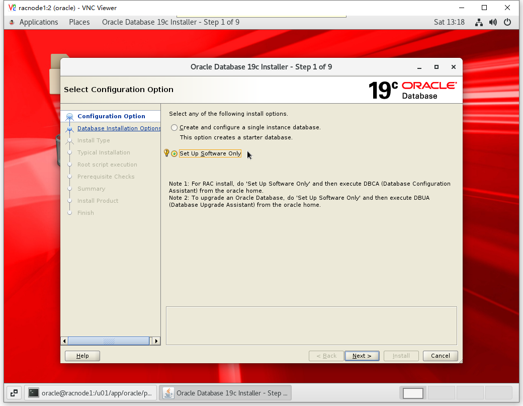 # 进入图形化桌面(打补丁) [oracle@racnode1 ~]$ cd $ORACLE_HOME [oracle@racnode1 dbhome_1]$ ./runInstaller -applyRU /soft/odb/31281355/ Preparing the home to patch... Applying the patch /soft/odb/31281355/... Successfully applied the patch. The log can be found at: /u01/app/oraInventory/logs/InstallActions2020-10-10_01-12-49PM/installerPat chActions_2020-10-10_01-12-49PM.log Launching Oracle Database Setup Wizard... # 进入图形化桌面(不打补丁) [oracle@racnode1 ~]$ cd $ORACLE_HOME [oracle@racnode1 dbhome_1]$ ./runInstaller