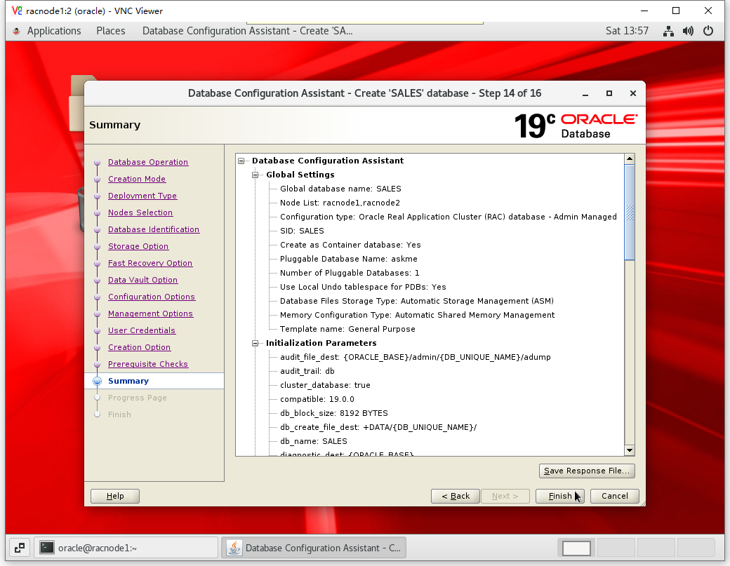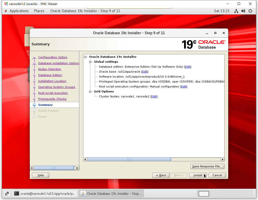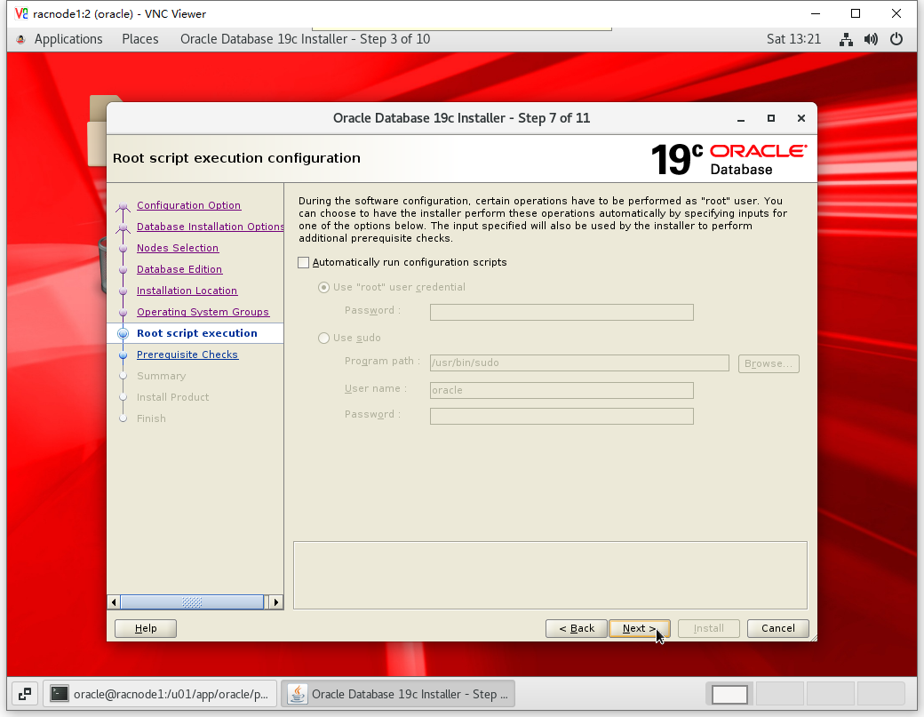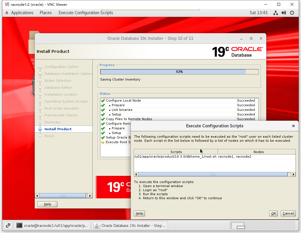 [root@racnode1 ~]# /u01/app/oracle/product/19.3.0/dbhome_1/root.sh Performing root user operation. The following environment variables are set as: ORACLE_OWNER= oracle ORACLE_HOME= /u01/app/oracle/product/19.3.0/dbhome_1 Enter the full pathname of the local bin directory: [/usr/local/bin]: The contents of "dbhome" have not changed. No need to overwrite. The contents of "oraenv" have not changed. No need to overwrite. The contents of "coraenv" have not changed. No need to overwrite. Entries will be added to the /etc/oratab file as needed by Database Configuration Assistant when a database is created Finished running generic part of root script. Now product-specific root actions will be performed.