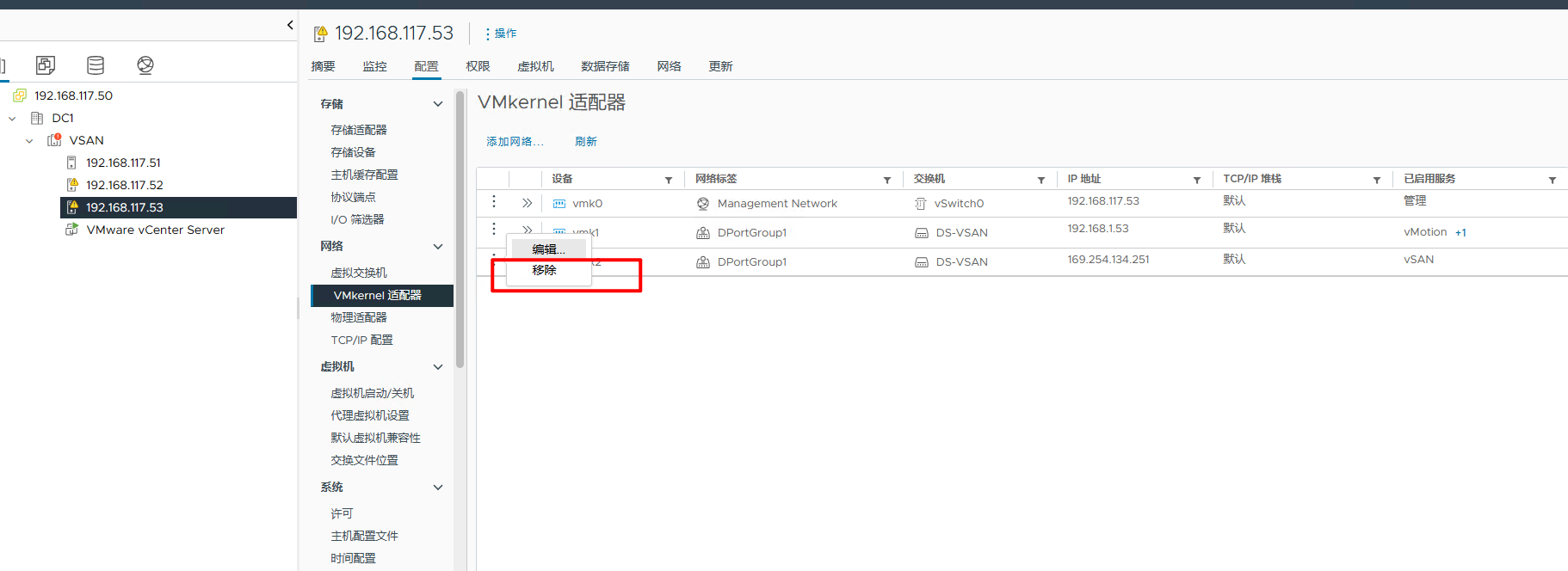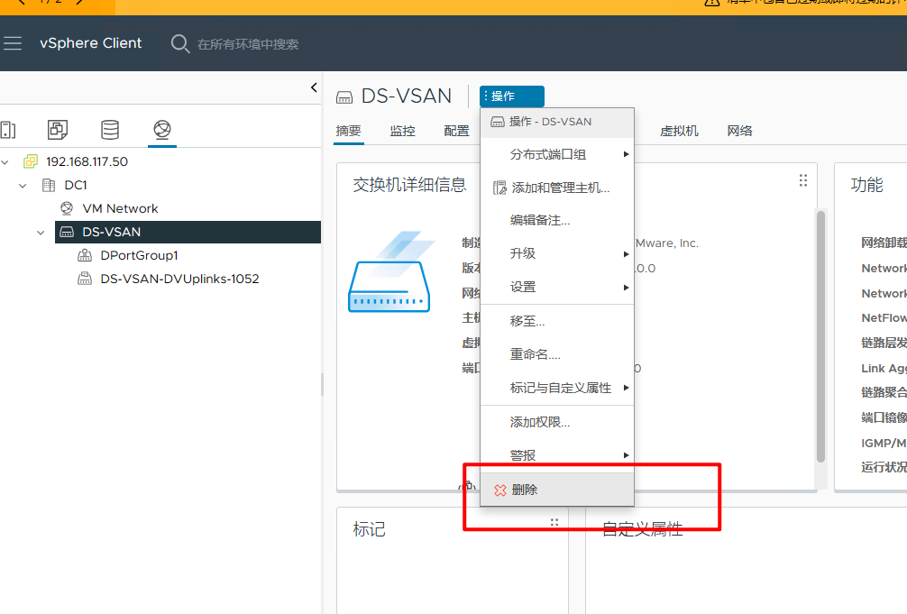 vmware移除分布式交换机 admin 2023-07-04 14:39 600 人阅读 0 条评论 首先要移除端口组使用的vmkernel适配器然后选中分布式交换机,选择删除 本文地址:https://www.liuchunjie.top/?id=605 版权声明:本文为原创文章,版权归 admin 所有,欢迎分享本文,转载请保留出处! 点赞 分享: PREVIOUS:kvm虚拟机ssh连不上的解决方法 NEXT:服务器四块硬盘在vsan里只看到两块 文章导航