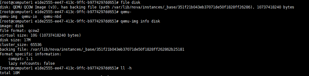 使用的是QCOW V3版本,QCOW格式特点之一就是:支持写时拷贝(COW, copy-on-write),镜像文件只反映底层的磁盘变化。