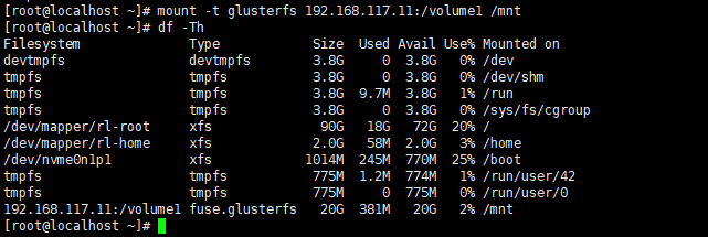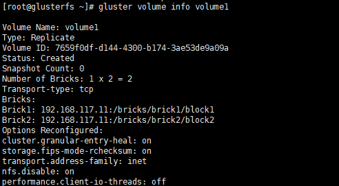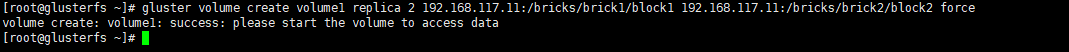[root@glusterfs ~]# gluster volume create volume1 replica 2 192.168.117.11:/bricks/brick1/block1 192.168.117.11:/bricks/brick2/block2 force