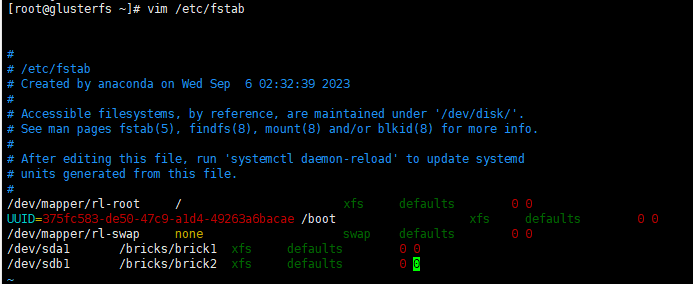 /dev/sda1 /bricks/brick1 xfs defaults 0 0