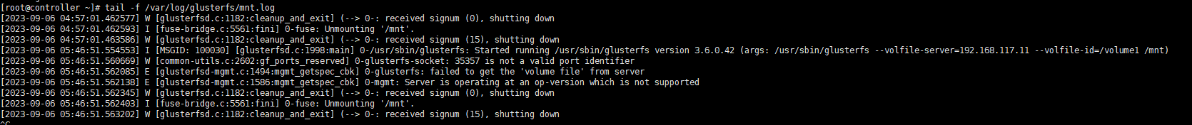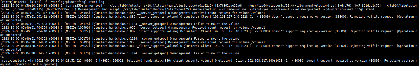 glusterfs客户端挂载提示Mount failed. Please check the log file for more details. admin 2023-09-06 15:23 430 人阅读 0 条评论 查看客户端和服务端的日志, 客户端: 服务端: 原因很明显,我的服务端和客户端版本差别过大,不支持挂载,所以更新版本即可 本文地址:https://www.liuchunjie.top/?id=634 版权声明:本文为原创文章,版权归 admin 所有,欢迎分享本文,转载请保留出处! 点赞 分享: PREVIOUS:rockylinux8安装glusterfs10 NEXT:windows输入共享文件目录提示此用户无法登录因为该账户被禁用 文章导航
