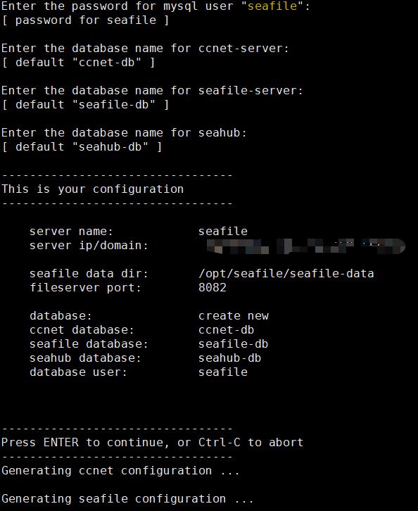 然后会询问你一些问题用来安装seafile