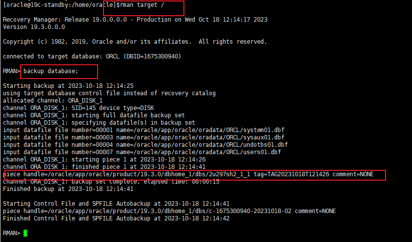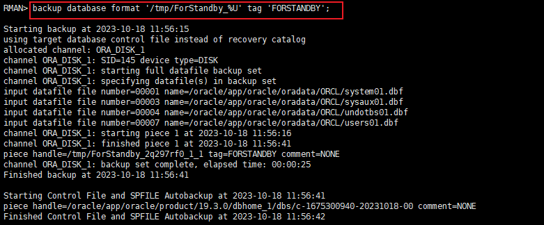 例如:backup database format '/tmp/ForStandby_%U' tag 'FORSTANDBY'; #备份数据库到/tmp目录下指定文件名格式和tag