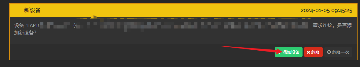 在另一台设备会弹出是否添加设备,点击添加设备即可
