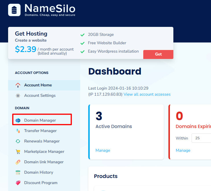 登录用户,选择域名管理
