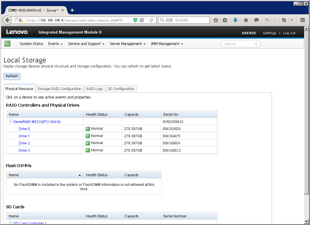 Local Storage,本地存储页面,在此页面可以查看硬盘、阵列卡,以及Flash DIMM和嵌入式SD卡的信息,并可配置RAID。