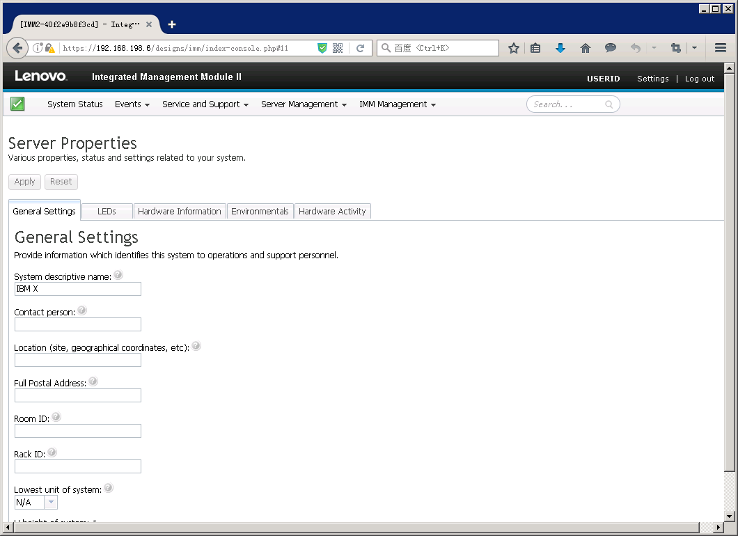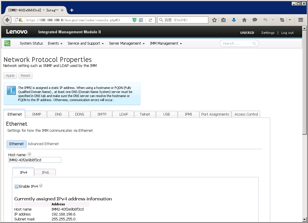 当未对IMM Network Configuration进行设置时,IMM远程管理口有默认IP地址,即192.168.70.125。如果只有临时需要登陆IMM,可采用本方法。