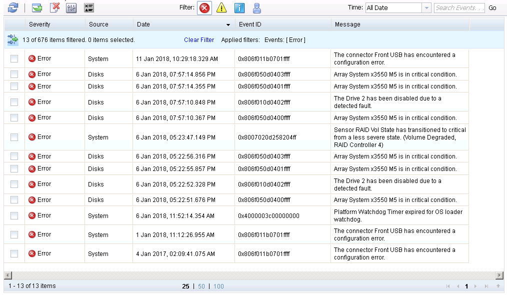 进入事件日志界面后,可以看到界面中的日志检查指示灯也是黄色,然后按照之前提示的事件级别和时间找到错误信息。