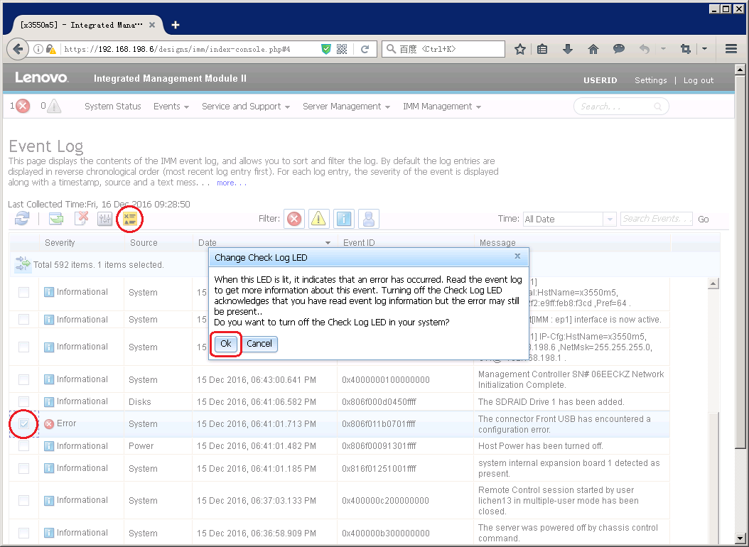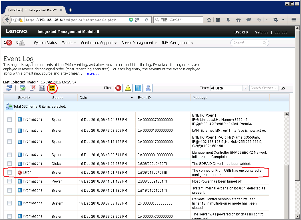 当服务器发生错误时,前面板的黄色日志检查指示灯会点亮,表示需要查看日志排查错误。如在本例中,服务器前置USB3.0接口出现故障,所以报错。