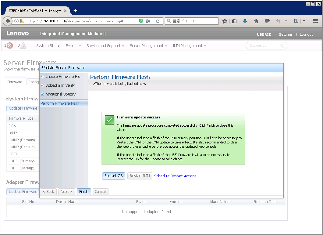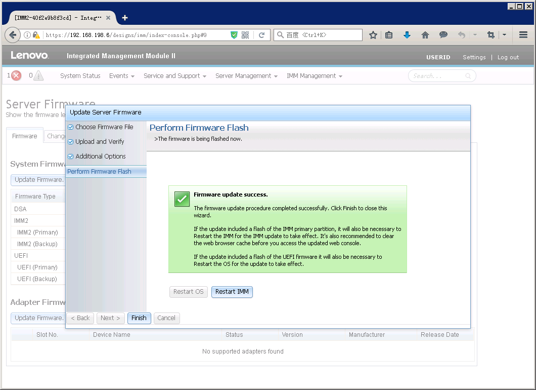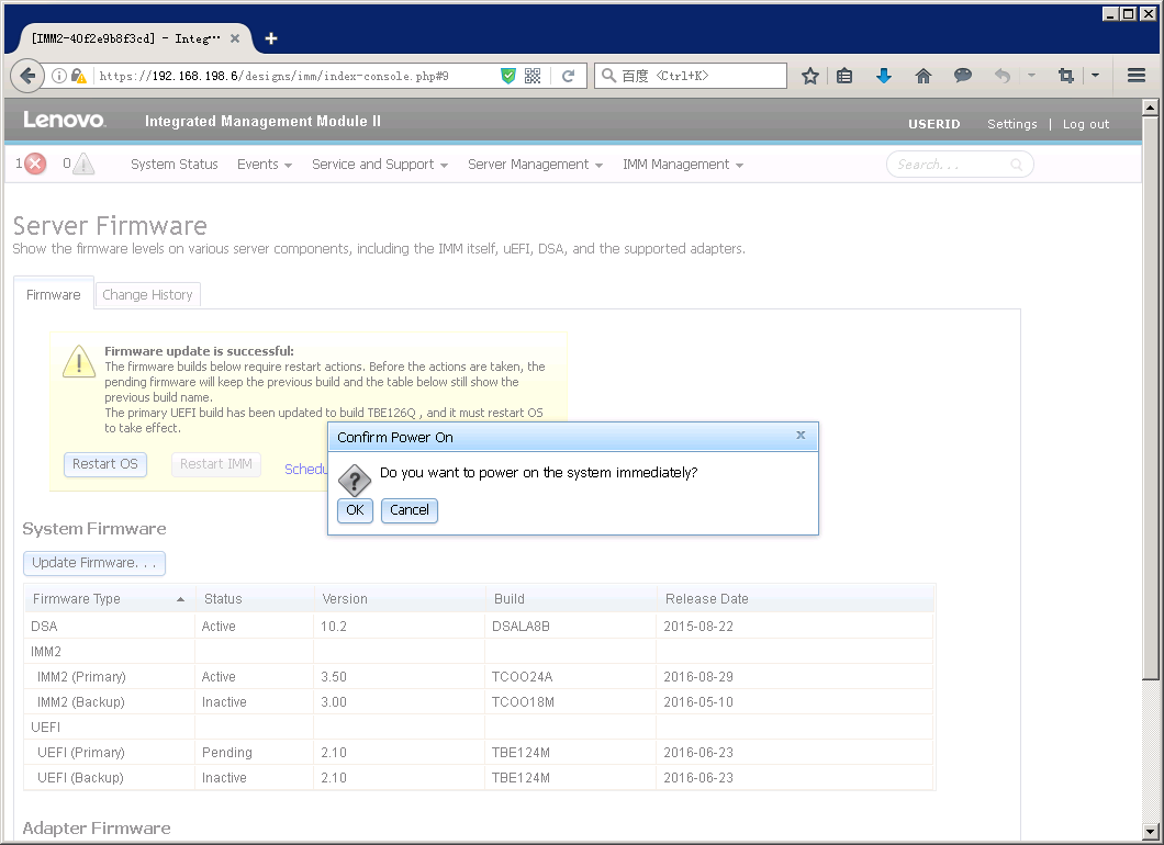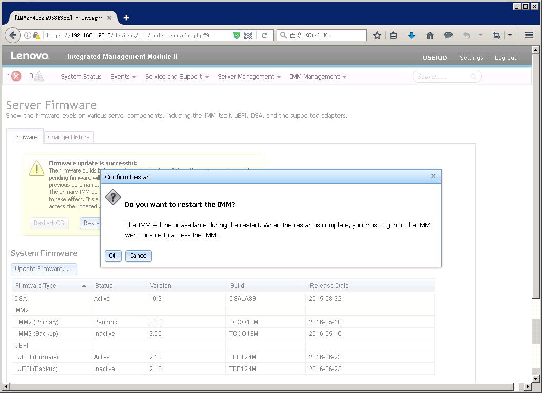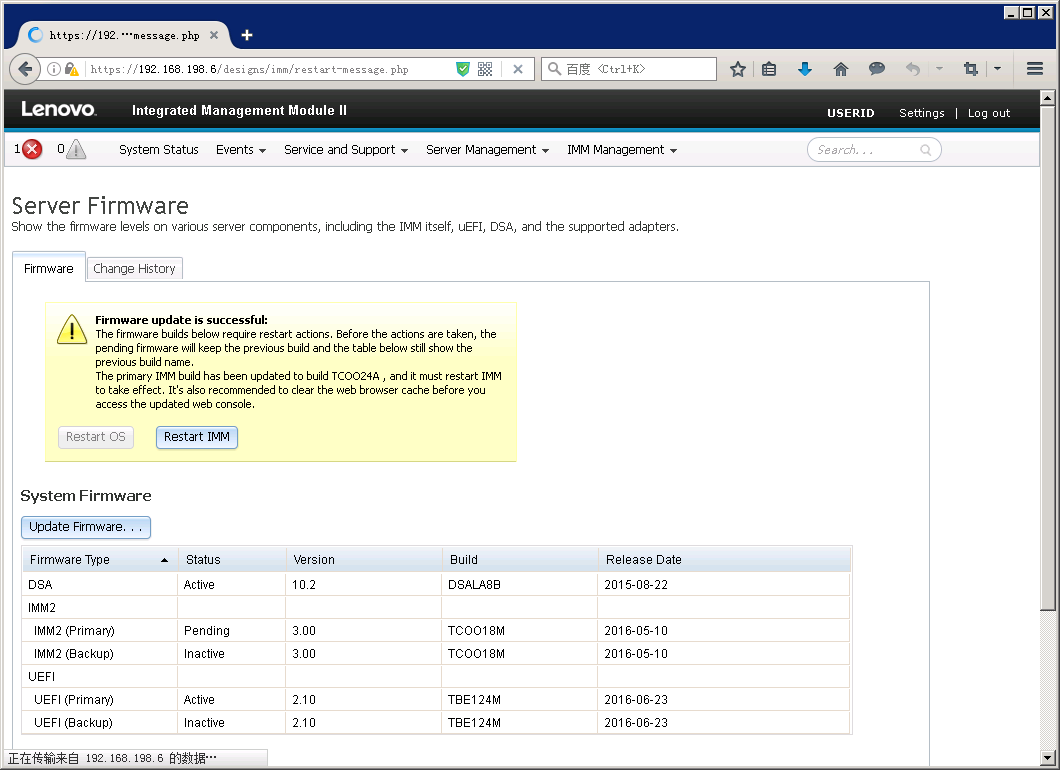 如果之前没有点击”Reset IMM”,在Server Firmware页面里也会有提示重启IMM。