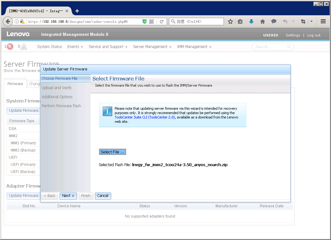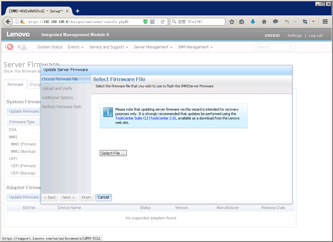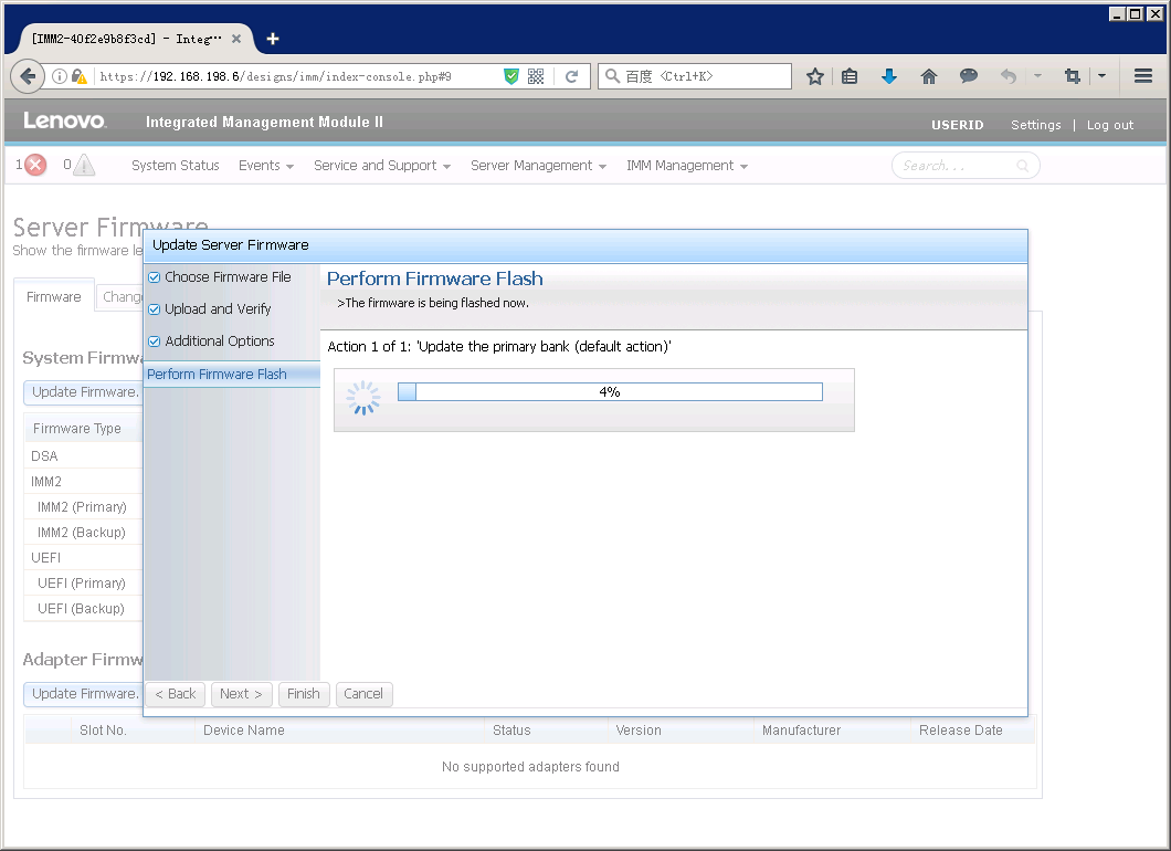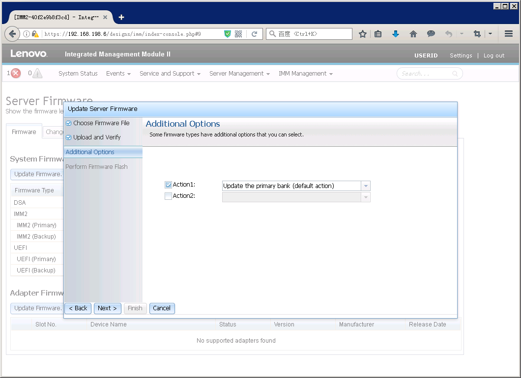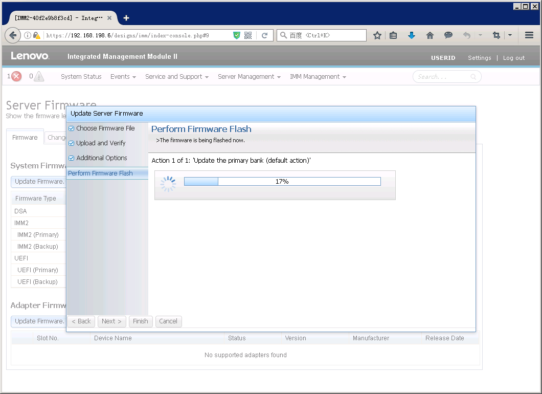 如果之前没有点击”Reset IMM”,在Server Firmware页面里也会有提示重启IMM。