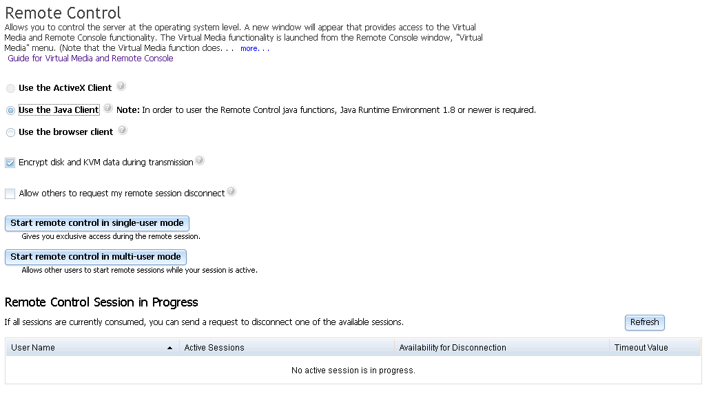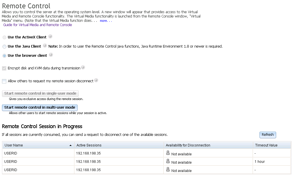 IMM中提供了远程终端(iKVM)及媒体重定向功能,在Server Management菜单的Remote Control页面中设置和使用。大部分机型的远程终端功能需要额外激活IMM Advanced Upgrade后才可使用。如果未激活远程终端功能,在Remote Control页面会提示远程功能不可用。