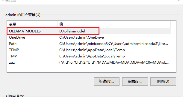 新建一个名称为OLLAMA_MODELS的变量,值为你要把模型放在哪里的文件夹的路径
