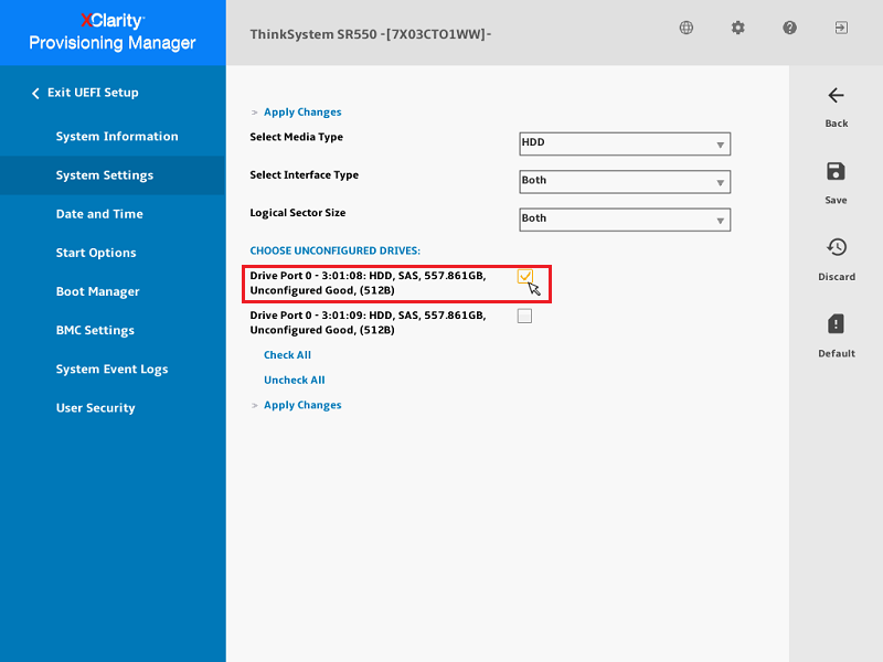 联想各系列服务器的UEFI HII界面有所不同,ThinkSystem系列服务器在图形界面中选择硬盘(如创建阵列)时,要勾选硬盘右侧的复选框。