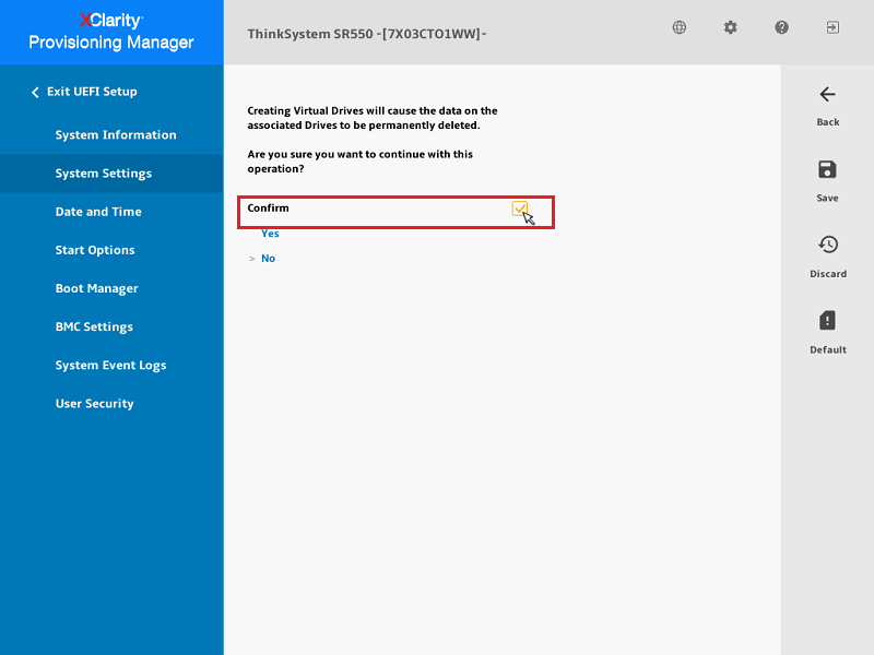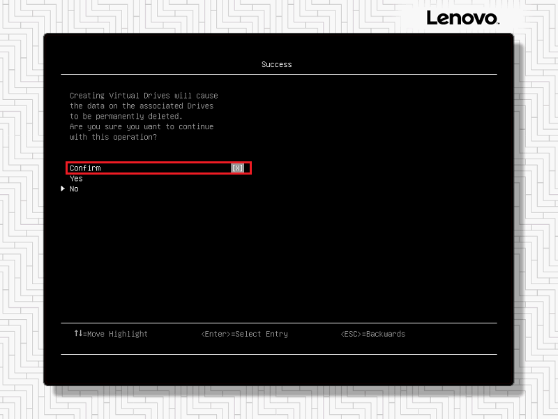 联想各系列服务器的UEFI HII界面有所不同,ThinkSystem系列服务器在最终确认(如创建阵列、清除阵列、重新初始化阵列)时,要勾选""右侧的复选框,然后再点击"Yes"。